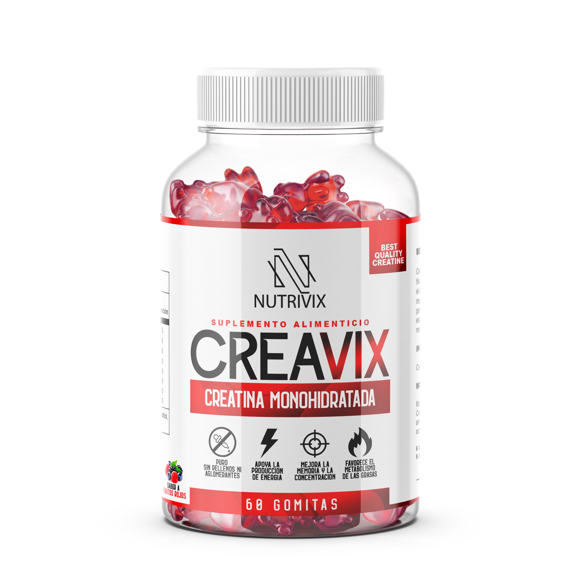 Potencia tu día con CREAVIX, la creatina monohidratada más práctica y deliciosa. Cada gomita aporta 2,5 g de creatina pura con sabor natural a frutos rojos y cero azúcar, diseñada para apoyar tanto a personas que buscan mejorar su concentración y memoria, como a deportistas que desean desarrollar fuerza y musculatura.